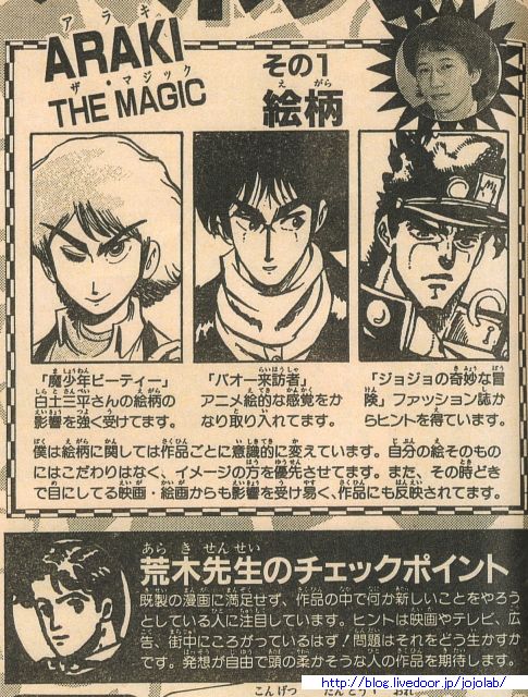 代表作「魔少年ビーティー」「バオー来訪者」「ジョジョの奇妙な冒険」を例に、
